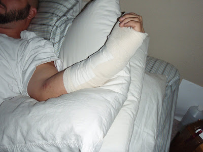 Adam went paintballing yesterday... He tripped and while trying to catch himself grabbed a piece of sheet metal. Note to self... don't grab the sheet metal! I got a phone call from my cousin Tyler, "so Adam fell and cut his hand, it's pretty bad. He dropped his gun, walked off the field, said he couldn't move his hand. It's pretty bad." Then I got a call from Derrek, "Ya I got Adam it's just a cut we are going to the hospital." JUST A CUT??? Well let's see after 2 Hospitals, 15 temporary stitches, A major surgery, 1 cut artery, 1nerve, some tendons, 2 cut muscles, 1 splint, 13 hours, and weeks/months of no working, driving, and some reconstructive therapy.... I'd say all we are missing is the partridge in a pear tree. Just a cut hu? First thing he said after he came out of surgery was..."I'm having a baby!" The nurse said, "you don't usually hear that when people first come out of anesthesia." Adam told every nurse, doctor, or passing citizen. So he's apparently excited! We will see how his hand does, we go back in next week. We are anxious to see the scar because the doctor had to cut it a few more times to get everything cleaned up.